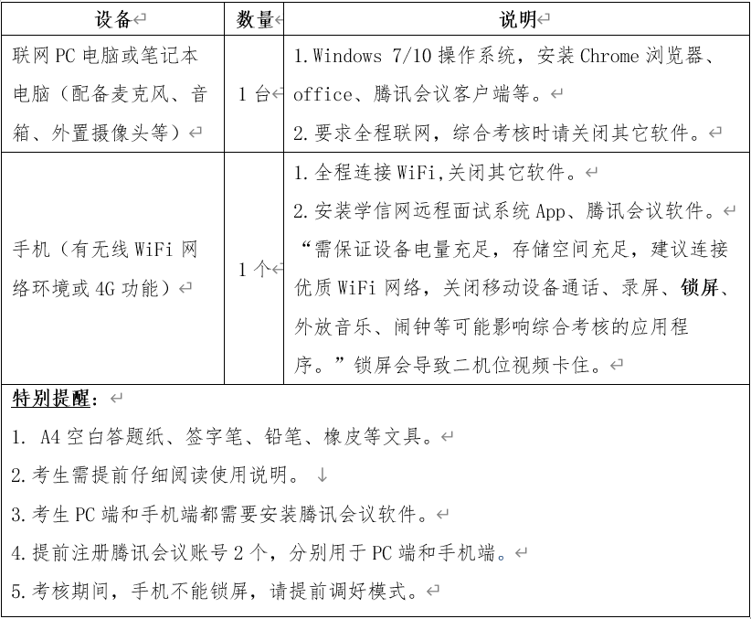 为确保考核过程系统顺畅,海角视频 将组织考生对考核系统提前进行测试。考生需提前做好远程网络视频软硬件设备的准备,并按海角视频 配合完成系统测试。海角视频 将依据考生预留的联系方式进行联络,请考生保持电话畅通,并及时查收邮件。考核正式开始时,考生须通过视频设备协助考核专家对周边环境进行360度无死角检查。